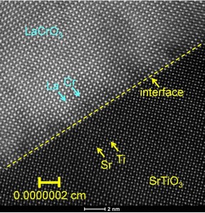 Source: PNNL Press Release, November 14, 2011. A cross-sectional scanning transmission electron micrograph of the interface between the polar lanthanum chromium oxide (LaCrO3) and the nonpolar strontium titanium oxide (SrTiO3). Although the interface appears to be atomically abrupt, detailed spectroscopic measurements show that cation mixing occurs in the interfacial region.
