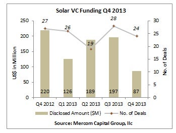 The report found that venture capital funding, which often helps startups move their technology from research or test stages to production was only $600 million, falling 40 percent from the $992 million in such deals in 2012. The report found that 97 venture capital deals were completed in 2013 compared to 106 in 2012. In the fourth quarter of 2013 venture capital spending in solar power was $87 million, less than half the $197 million in previous year’s quarter.